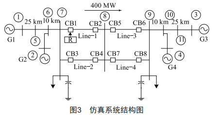 為驗證所提方法的正確性,考慮使用Matlab對四機兩區(qū)域的系統(tǒng)進行仿真。該網(wǎng)絡(luò)由4臺發(fā)電機和11條母線組成,其單線圖如圖3所示。在7號母線上安裝了距離繼電器以保護1號線,引起線路1振蕩的故障在線路4上產(chǎn)生,對獲得的電流信號進行處理以獲得SI值,距離保護閉鎖和解閉鎖通過圖2所示算法實現(xiàn)。