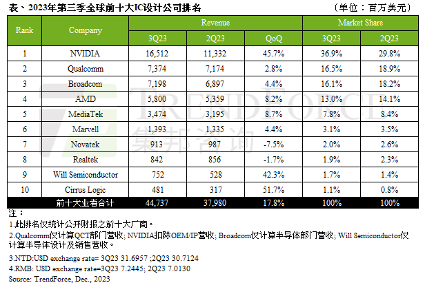 TrendForce集邦咨詢: 消費旺季與AI熱潮延續(xù),推升2023年第三季全球前十大IC設(shè)計業(yè)者營收季增17.8%