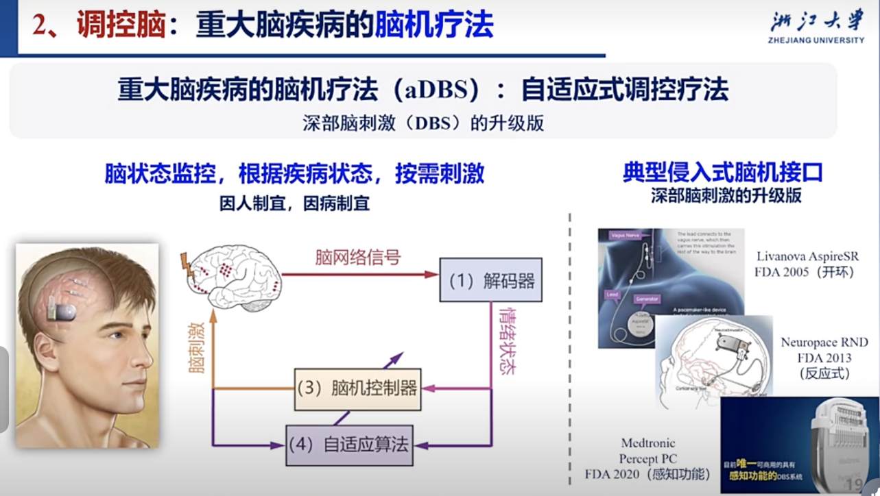 第二個腦控研究方向是通過調控實現(xiàn)重大腦部疾病的腦機療法。這是針對深度腦刺激的升級療法,實現(xiàn)自適應的調控療法,能夠對腦狀態(tài)實時監(jiān)控,根據(jù)具體疾病狀況,按需刺激,實現(xiàn)因人制宜、因病制宜的效果。