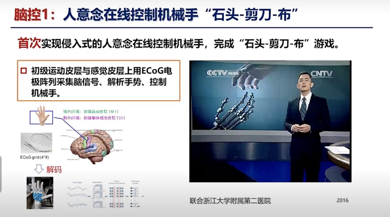 首先在腦控方面,浙大開展了多種不同的應用方向。一是可以讓人通過意念在線控制機械手實現(xiàn)譬如“石頭剪刀布”之類的游戲。這需要在初級運動皮層與感覺皮層上用ECOG電極陣列采集腦信號,然后通過后端的計算部分來解碼腦信號實現(xiàn)手勢解析,最終將控制信號傳遞到機械手完成控制。