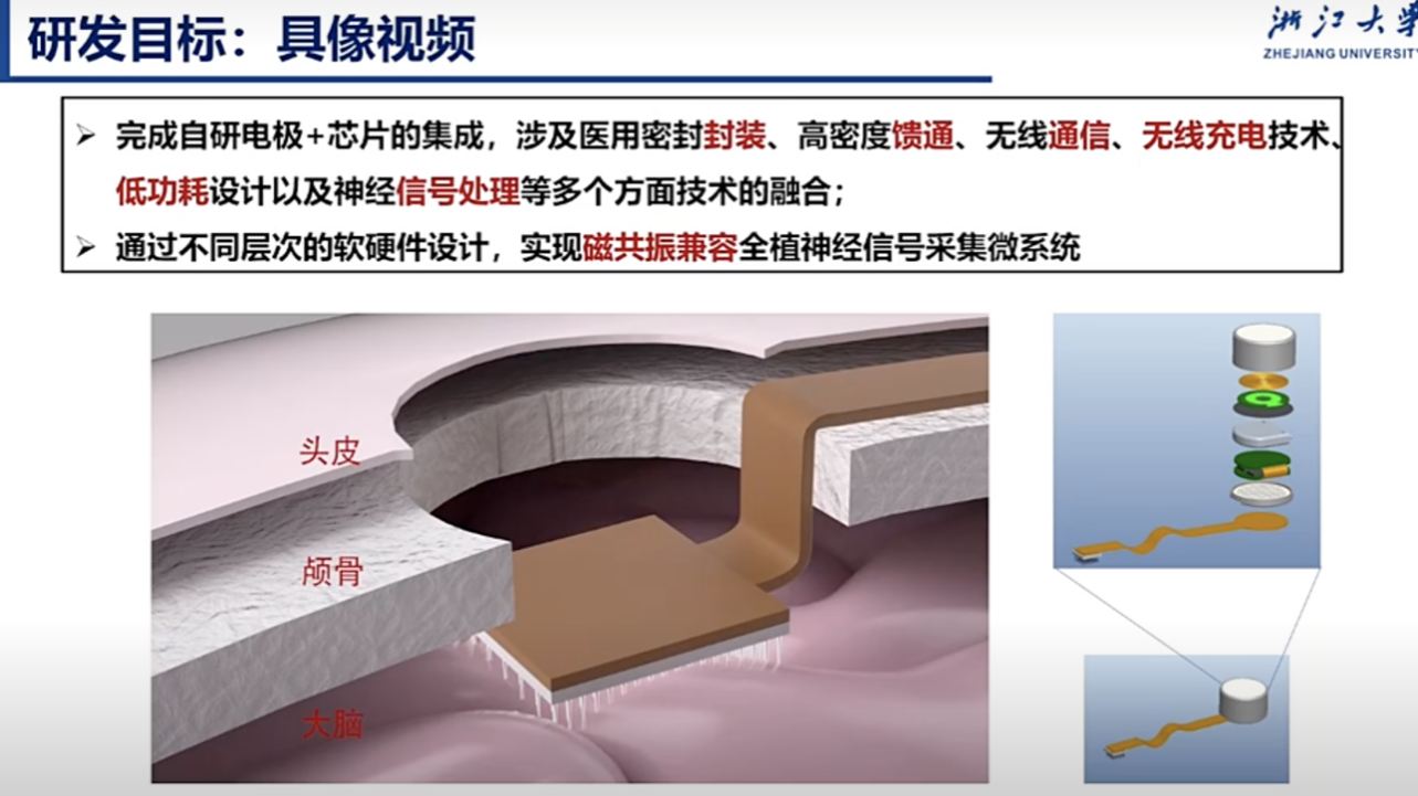 王躍明表示,剛柔各有優(yōu)勢,如何實現(xiàn)剛柔可調的接入,是腦機接口技術的發(fā)展關鍵。浙大的研究目標是通過自研電極+芯片的集成實現(xiàn)具象視頻。這里面涉及到醫(yī)用密封封裝、高密度饋通、無線通信、無線充電技術低功耗設計以及神經(jīng)信號處理等多個方面技術的融合;需要通過不同層次的軟硬件設計,實現(xiàn)磁共振兼容全植神經(jīng)信號采集微系統(tǒng)。