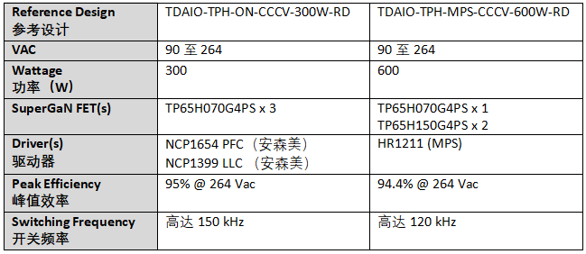 新發(fā)布的300 W 和 600 W 參考設(shè)計(jì)將 SuperGaN FET 與控制器配對(duì),采用流行的功率因數(shù)校正 (PFC) 和諧振 LLC 拓?fù)?,其?LLC 特別針對(duì)寬電池電量范圍(從空電到滿電)的設(shè)計(jì)。利用 Transphorm 的 SuperGaN 平臺(tái),電源系統(tǒng)開(kāi)發(fā)人員能夠最大限度發(fā)揮PFC+LLC的性能潛力,以最具競(jìng)爭(zhēng)力的成本實(shí)現(xiàn)這些拓?fù)渌苓_(dá)到的最高效率。