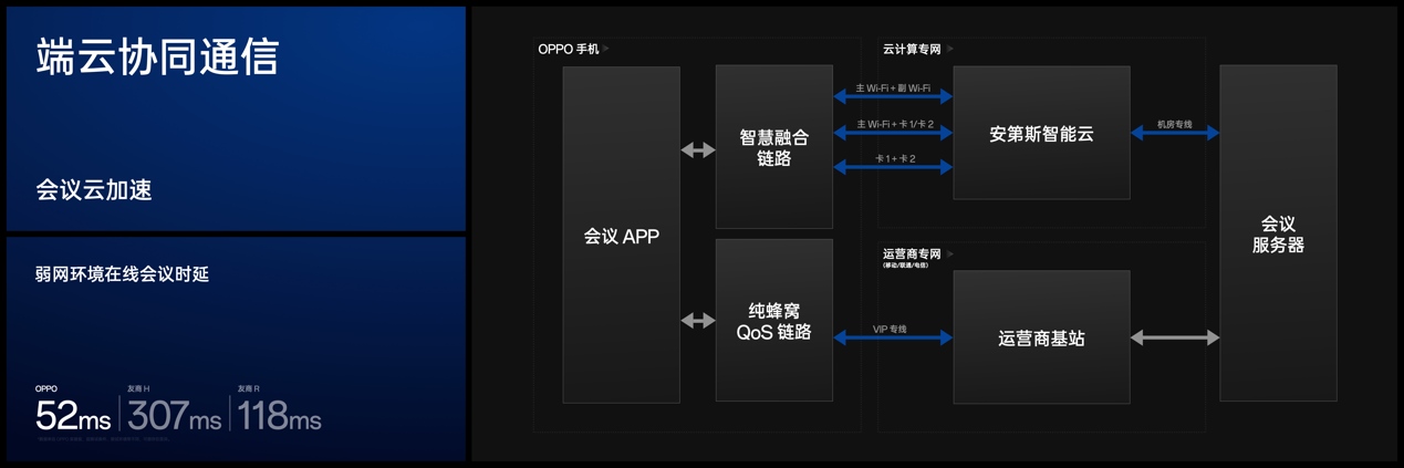 OPPO獨(dú)有的智慧通信技術(shù)利用安第斯智能云提供的智能計(jì)算服務(wù),行業(yè)領(lǐng)先的智慧融合鏈路技術(shù),并結(jié)合跨層數(shù)據(jù)加速能力,實(shí)現(xiàn)Wi-Fi和蜂窩多網(wǎng)絡(luò)組合的加速策略。此外,基于通信QoS鏈路技術(shù),OPPO通過三大運(yùn)營(yíng)商5G精品專網(wǎng)的建立,實(shí)現(xiàn)對(duì)會(huì)議數(shù)據(jù)進(jìn)行加速,改善會(huì)議時(shí)延。