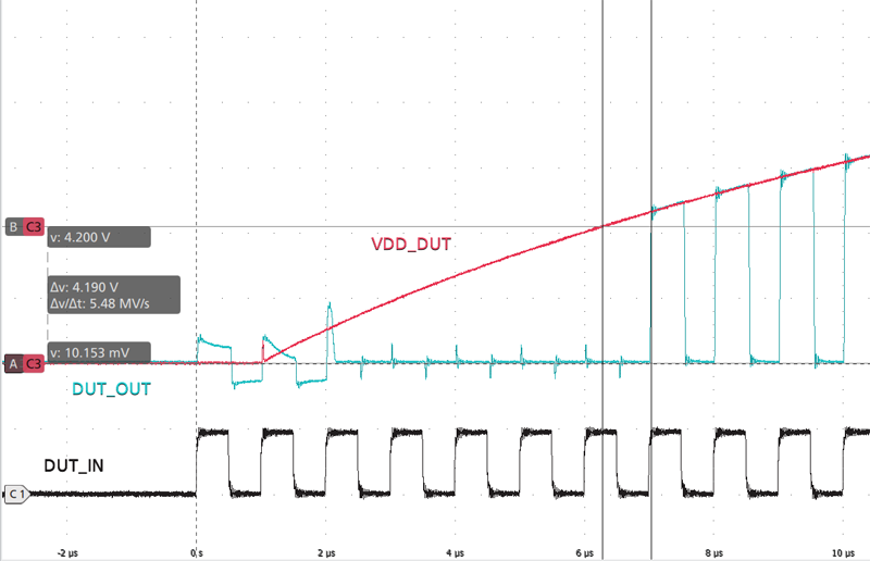 市場上大多數(shù)柵極驅(qū)動IC的UVLO啟動時間為5μs或更長。全新EiceDRIVERTM 2EDN柵極驅(qū)動IC的UVLO啟動時間(tSTART)為1.8μs(典型值),因此,在解除UVLO時僅丟失最少數(shù)量PWM脈沖,從而實現(xiàn)安全的轉(zhuǎn)換器啟動和可靠運行。圖7所示為UVLO恢復(fù)過程中的tSTART實測數(shù)據(jù)。