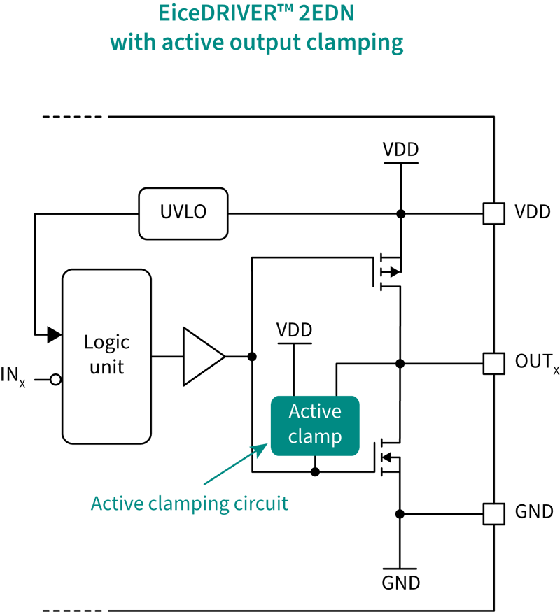 為了克服這個問題,全新EiceDRIVERTM 2EDN通過引入快速可靠的輸出電壓有源箝位機制,優(yōu)化了輸出級,如圖3右圖所示。有源箝位機制可檢測輸出引腳上的電壓,并使VGS保持在安全的低電壓狀態(tài),直到UVLO解除。所以,驅(qū)動器能夠在驅(qū)動器VDD電壓啟動過程中做出更快的反應(yīng),從而防止在向功率開關(guān)柵極施加低VGS柵極電壓時發(fā)生MOSFET開關(guān)動作。