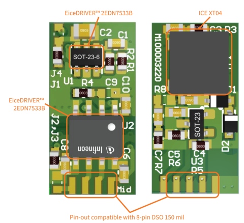 KIT_1EDB_AUX_SiC評估板的橫截面(圖11)經(jīng)專門設(shè)計,可以焊接到DSO-8單通道隔離型柵極驅(qū)動IC(如EiceDRIVERTM 1EDB6275F)的封裝上,并像在子母板中那樣用于取代現(xiàn)有的無隔離電源的DSO8驅(qū)動器。