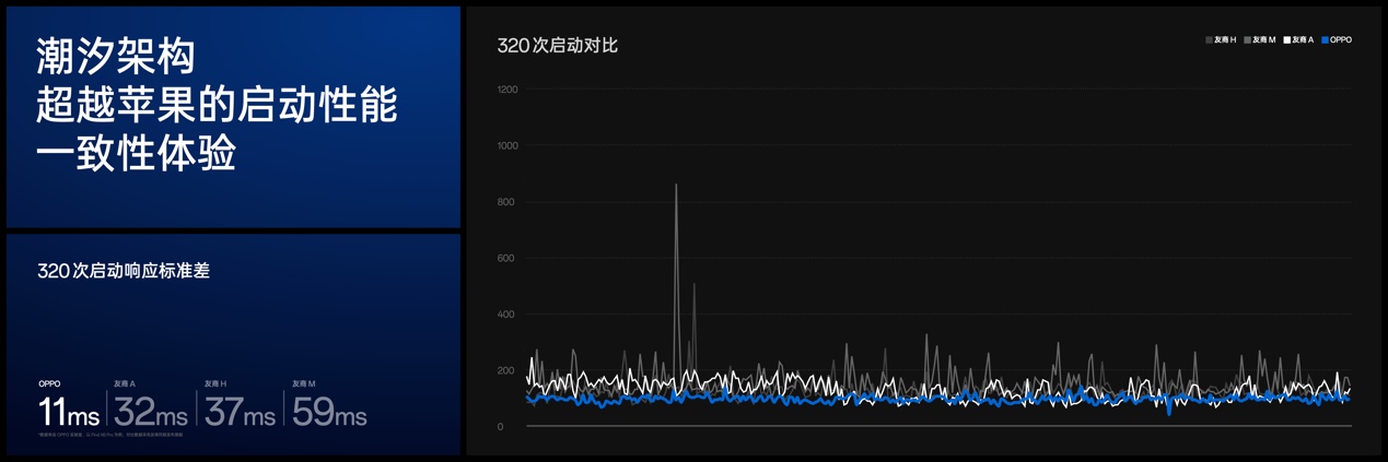 此外,潮汐架構(gòu)還支持全新的芯片內(nèi)場景級算力、功耗分析模型,能夠?qū)崿F(xiàn)基于單場景的動態(tài)算力與功耗評估和分析,以及實時動態(tài)地將每一個計算任務(wù)拆解到芯片上各個計算單元的算力分布,找出做到最佳能效組合,為多樣性的用戶應(yīng)用都實現(xiàn)更具競爭力的能效表現(xiàn)。通過精準地動態(tài)調(diào)度GPU的算力,潮汐架構(gòu)還可以出色地控制顯示時延,為 FindX7 實現(xiàn)前所未有的持續(xù)流暢體驗。在模擬用戶一天320次啟動應(yīng)用的測試中,搭載潮汐架構(gòu)的Find X7 標準差只有11ms,實現(xiàn)了比同平臺和其他平臺都持久穩(wěn)定的流暢表現(xiàn)。