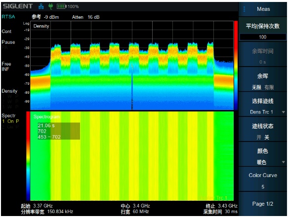 SHA860A實(shí)時(shí)分析帶寬最大 110 MHz,能以100% POI 捕獲最短 3.51 μs 的信號(hào)。RTSA模式下,分析儀能在實(shí)時(shí)分析帶寬之內(nèi)無(wú)縫地進(jìn)行FFT計(jì)算和頻譜觸發(fā),十分有利于瞬態(tài)信號(hào)的捕獲,分析信號(hào)頻率、信號(hào)特征、持續(xù)時(shí)長(zhǎng)、幅度變化等。在頻譜監(jiān)測(cè)、跳頻電臺(tái)測(cè)試、振蕩器研發(fā)等領(lǐng)域有著廣泛的應(yīng)用。