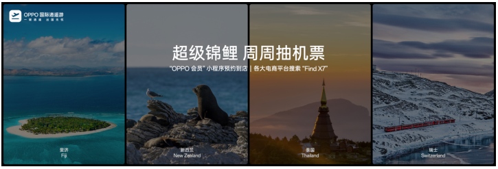 OPPO聯(lián)合小紅書(shū),和斐濟(jì)旅游局、新西蘭旅游局、瑞士國(guó)家旅游局、泰國(guó)國(guó)家旅游局四大海外旅游局,共同發(fā)起2024 OPPO國(guó)際逍遙游計(jì)劃。從1月8日起至2月2日,前往線下門(mén)店或電商平臺(tái)搜索Find X7,就可以參與超級(jí)錦鯉抽獎(jiǎng)活動(dòng),有機(jī)會(huì)免費(fèi)獲得四國(guó)機(jī)票。