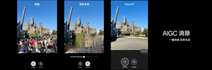 得益于全新的大模型能力,F(xiàn)indX7 帶來(lái)全新的 AIGC消除功能。相比同平臺(tái)其他模型只能支持人體的識(shí)別,F(xiàn)indX7 不僅支持超過(guò)120類(lèi)主體的識(shí)別與分割,還可以實(shí)現(xiàn)發(fā)絲級(jí)的分割、高達(dá)6個(gè)的多主體分離,以及超大面積圖像的填充與自然生成,極大地拓展了生成式視覺(jué)大模型的使用范圍與實(shí)用性,讓用戶可以體驗(yàn)到全新一代的圖像編輯體驗(yàn)。