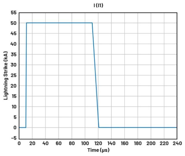 我們通過仿真來獲得準(zhǔn)確的值。圖7顯示了一次50 kA雷擊,上升時(shí)間為1 μs,下降時(shí)間為10 μs。