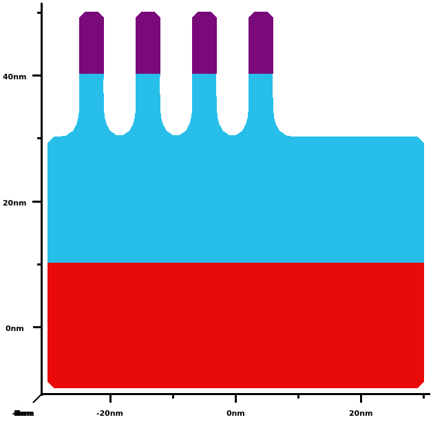 圖2:SEMulator3D 模型,硅晶體(紅色)、氧化物(淺藍(lán)色)和在光刻膠中顯影的四個(gè)鰭片(紫色)