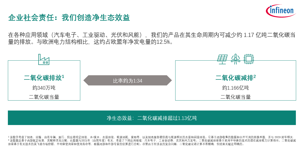 我們正向著公司制定的碳中和目標(biāo)全速邁進(jìn):到2023財(cái)年末,盡管業(yè)務(wù)增長(zhǎng)了約一倍,但公司的碳排放量與2019年的基準(zhǔn)相比減少了 56.8%。并且英飛凌產(chǎn)品和解決方案在使用過程中實(shí)現(xiàn)的二氧化碳減排量相當(dāng)于生產(chǎn)過程中二氧化碳排放量的34倍。
