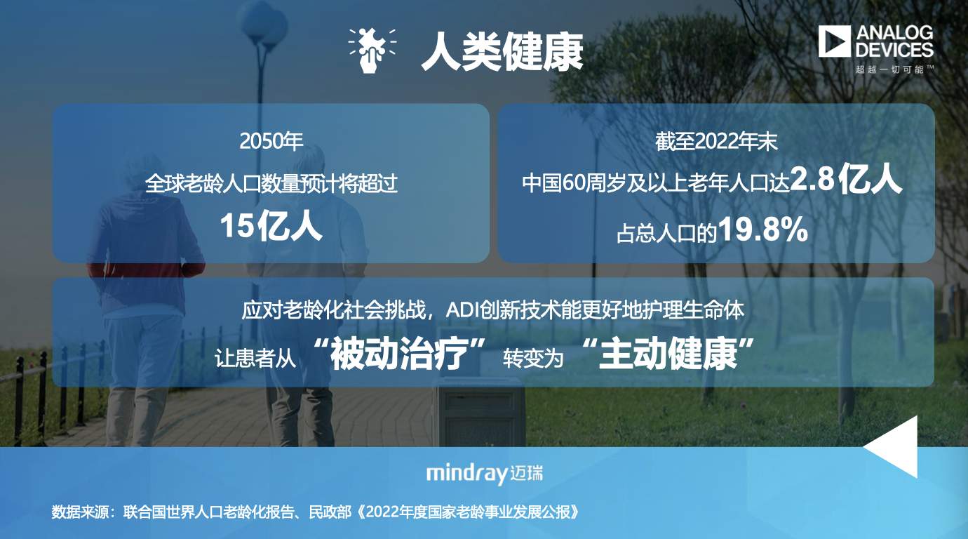 在人類健康的領(lǐng)域,ADI更是獨(dú)具專長(zhǎng)。例如在血糖監(jiān)測(cè)領(lǐng)域,ADI已經(jīng)和中國(guó)客戶聯(lián)手進(jìn)行貼片式的連續(xù)血糖監(jiān)測(cè)產(chǎn)品開發(fā),未來人們可以通過更便捷的方式來實(shí)現(xiàn)準(zhǔn)確的血糖連續(xù)監(jiān)測(cè)。而在CT和X光這類影像醫(yī)學(xué)檢測(cè)方面,ADI提供了高精度的解決方案,在圖像成像分辨率方面更優(yōu)于友商的多解決方案,因此可以縮短整個(gè)檢測(cè)過程的掃描時(shí)間,減少患者受到的輻射。在嚴(yán)重急性腎損傷(AKI)方面,患者現(xiàn)在多采用的是連續(xù)性腎臟替代治療(CRRT)方案。這是一種通過體外循環(huán)血液凈化的治療方式,患者必須每天抽血幾次進(jìn)行過濾治療。ADI的生物傳感器能夠持續(xù)監(jiān)測(cè)關(guān)鍵離子,應(yīng)用之后可將抽血次數(shù)減少到每天一次,不僅提高了護(hù)士工作效率,還減輕了患者的痛苦。