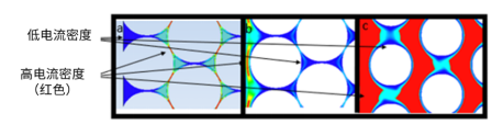 圖4:虛擬模型實(shí)驗(yàn)中的電流密度俯視圖,每項(xiàng)設(shè)定(如圖a、b和c所示)根據(jù)不同實(shí)驗(yàn)有所變化(參閱圖1)。a) 導(dǎo)通路徑不連續(xù),導(dǎo)致電流流入字線內(nèi)部。b) 存儲(chǔ)孔大小與圖a中的一致,但較寬的導(dǎo)通路徑使電流沿著字線外邊緣流動(dòng)。c) 字線軌距產(chǎn)生更均勻的電流密度圖形。