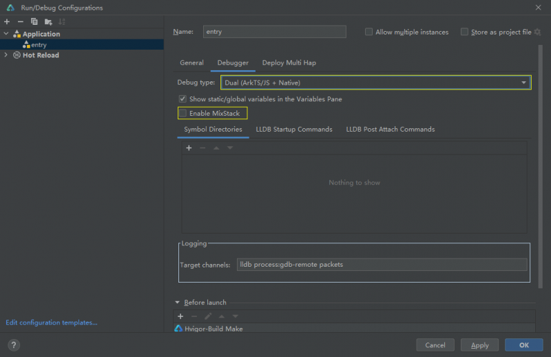 開發(fā)者只需在調(diào)試設(shè)置界面將Debug type設(shè)置為“Dual(ArkTS/Js + Native)”,開啟混合調(diào)試模式。