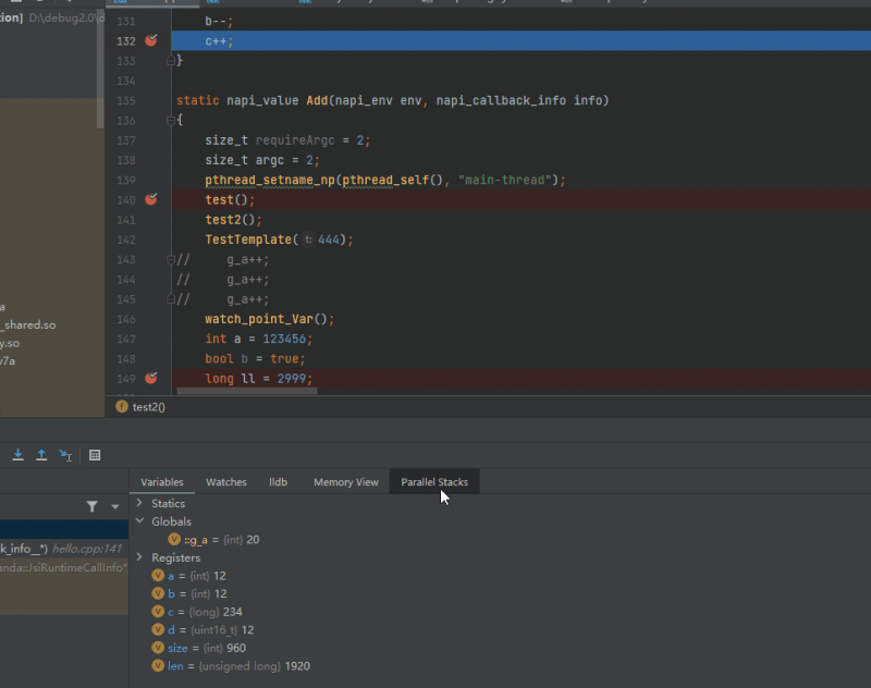 當(dāng)step into跳入到C++方法的代碼中繼續(xù)進(jìn)行調(diào)試時(shí),DevEco Studio提供了并行棧視圖功能,支持在程序停住時(shí),可同時(shí)展示多個(gè)線程的調(diào)用棧信息,并且自動(dòng)合并重復(fù)調(diào)用棧,方便開發(fā)者分析程序的并發(fā)執(zhí)行情況,以及發(fā)現(xiàn)潛在的多線程問題。而且支持雙擊視圖上的調(diào)用棧跳轉(zhuǎn)到對(duì)應(yīng)堆棧,來查看該堆棧的變量信息。