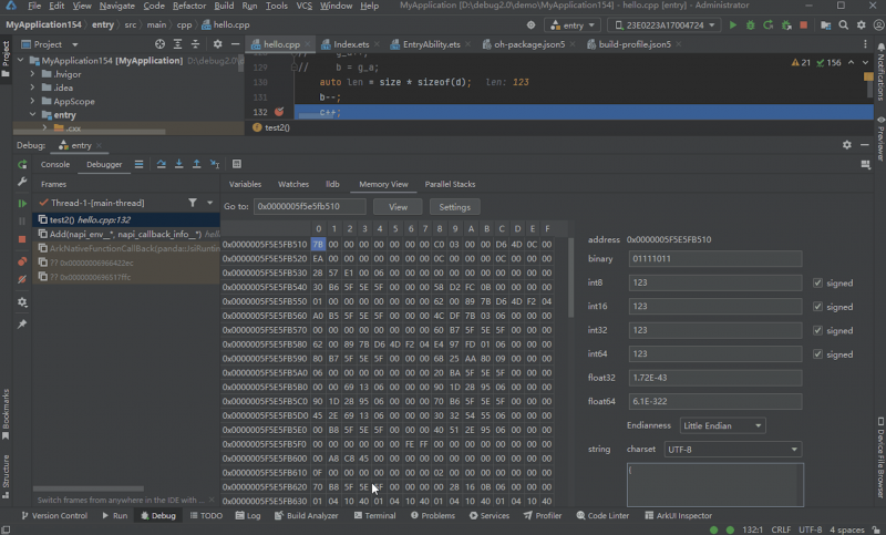 調(diào)試C++代碼時(shí),DevEco Studio還支持內(nèi)存查看和修改,開發(fā)者可以查看指定地址的內(nèi)存,進(jìn)行內(nèi)存轉(zhuǎn)換、查看變量的內(nèi)存,以及內(nèi)存修改等操作。