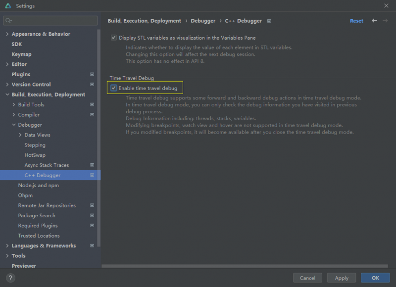 打開File > Settings > Build,Execution,Deployment > Debugger > C++ Debugger設(shè)置界面,勾選Enable time travel debug開啟C++反向調(diào)試。