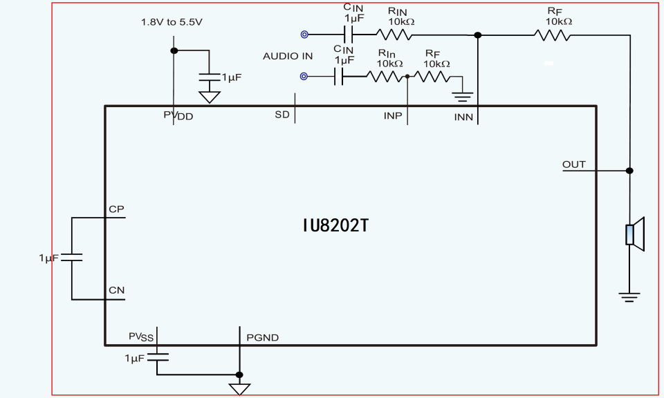IU8202T采用單端模式輸出,其直驅(qū)模式結(jié)構(gòu)單電源供電時(shí)能夠產(chǎn)生以地為參考的輸出,從而省 去了大尺寸的隔直電容,既節(jié)省了成本和電路板空間, 也降低了元件的高度。