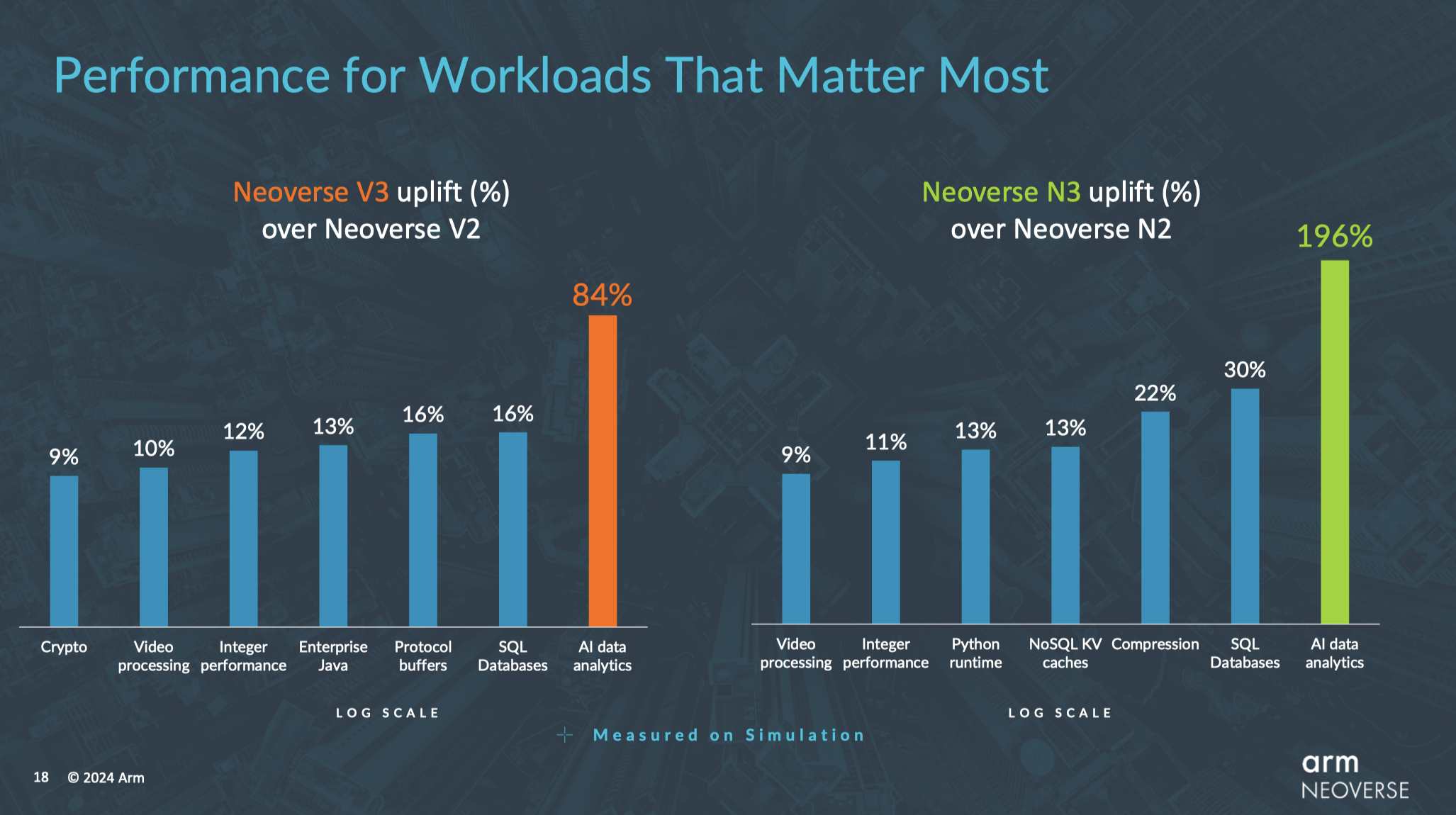 據(jù)Dermot O’Driscoll介紹,相較于前一代Neoverse平臺,新一代的Neoverse N3和V3在各種關鍵工作負載下都實現(xiàn)了全面的提升?!癗 系列在壓縮方面取得了性能優(yōu)勢,可降低云服務運營商的成本,并最終降低云服務客戶的成本。同樣地,V 系列顯著提高了協(xié)議緩沖區(qū)的性能,這是在數(shù)據(jù)中心內傳輸數(shù)據(jù)的一項關鍵功能?!?