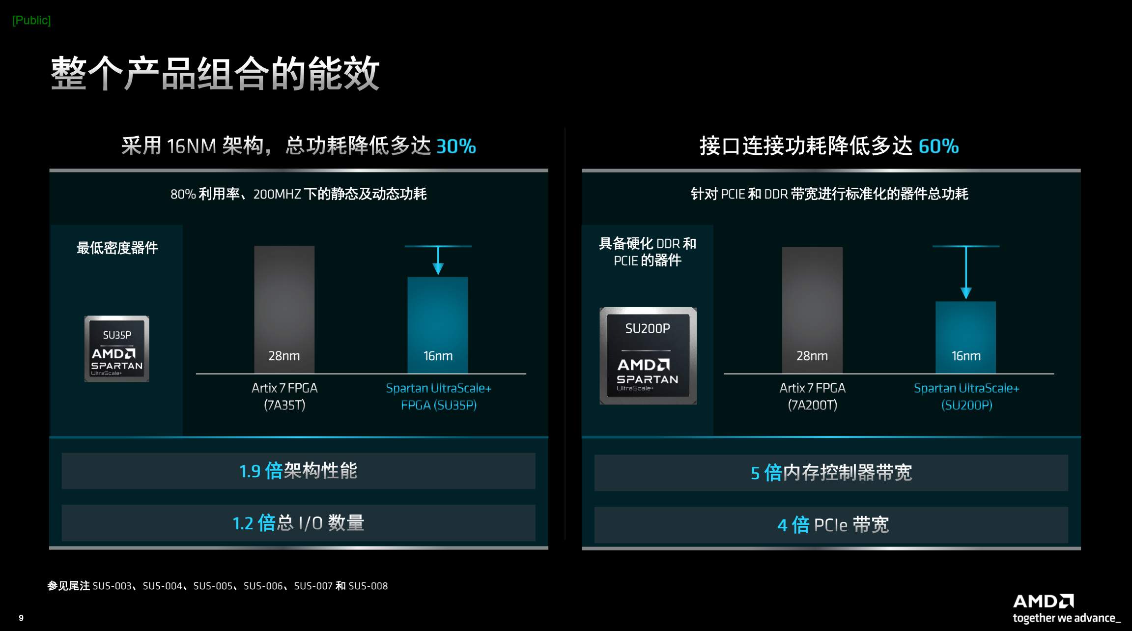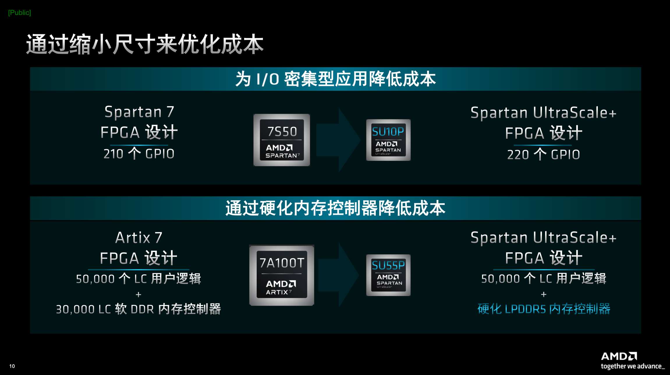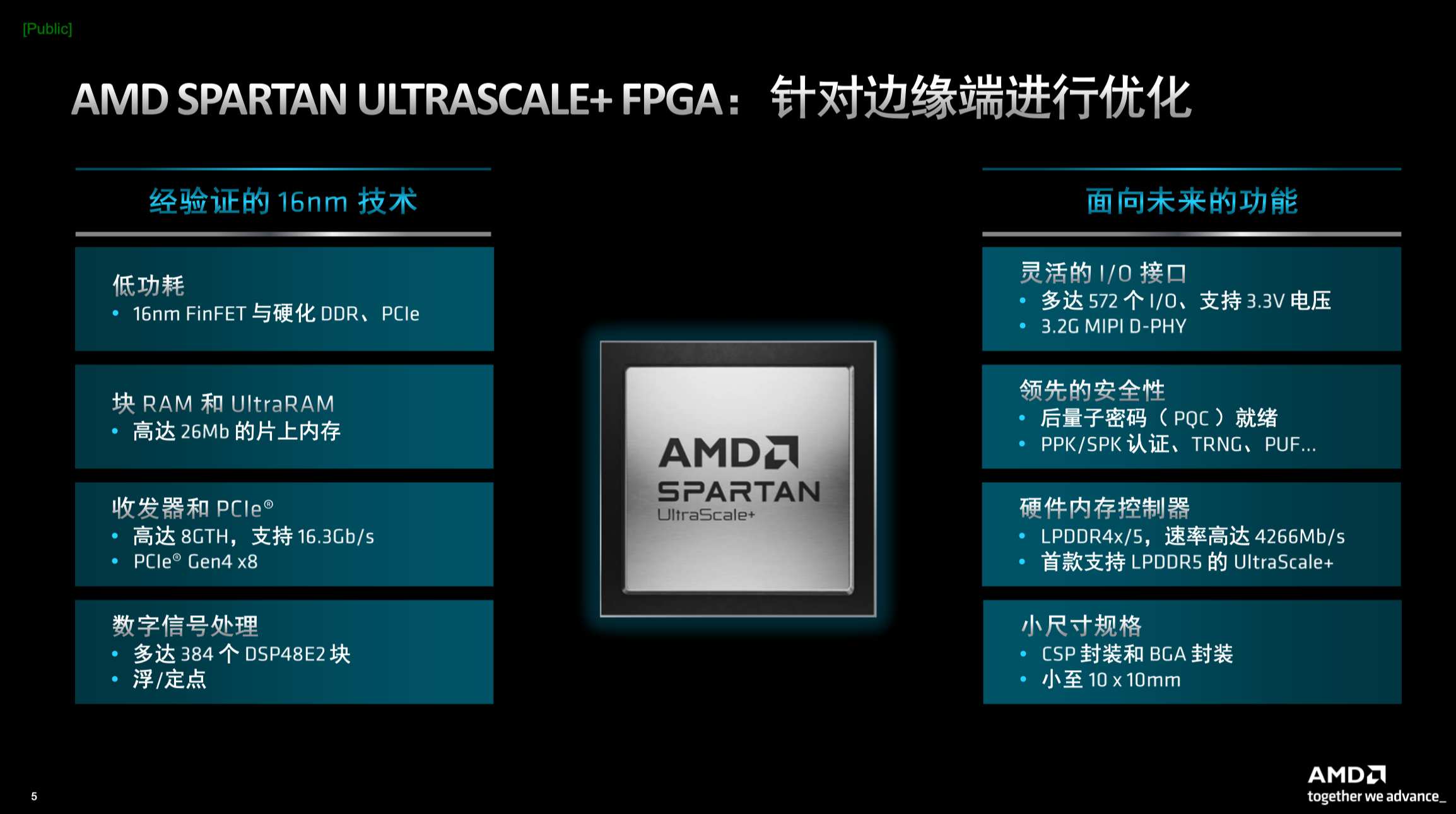 當(dāng)我們提到成本優(yōu)化型FPGA,往往與簡(jiǎn)化邏輯資源、有限I/O和較低制造工藝聯(lián)系在一起。誠(chéng)然,在成本受限的系統(tǒng)設(shè)計(jì)中,對(duì)于價(jià)格、功耗和尺寸的要求更為敏感;但隨著一系列創(chuàng)新應(yīng)用的發(fā)展、隨著邊緣AI的深化,成本優(yōu)化型FPGA也不再與低端劃等號(hào),而是會(huì)在滿足邊緣端側(cè)設(shè)備功耗水平基礎(chǔ)上,提供更高的功能性和靈活性。此次AMD推出的SUS+,是針對(duì)下一代、新一代的邊緣設(shè)備做設(shè)計(jì)考量的,該系列以更高的I/O數(shù)、硬化控制器、先進(jìn)的安全特性和16nm工藝等特色,成為了業(yè)界新一代成本優(yōu)化型FPGA產(chǎn)品的標(biāo)桿。