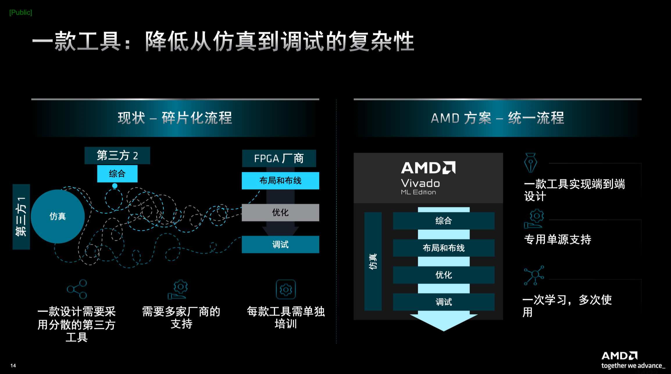 Romisaa強(qiáng)調(diào):“AMD VIVADO 設(shè)計(jì)工具最大的優(yōu)勢(shì),就是我們的集成和整合。其他供應(yīng)商的現(xiàn)狀是非常分散化、碎片化的流程,但是AMD的思路,是把它做到了統(tǒng)一?!?如果客戶持續(xù)選擇AMD的FPGA產(chǎn)品,那么可以獲得來(lái)自VIVADO的一致的端到端開發(fā)體驗(yàn),客戶只需要一次學(xué)習(xí),就可以將經(jīng)驗(yàn)多次運(yùn)用在各種不同的產(chǎn)品中。