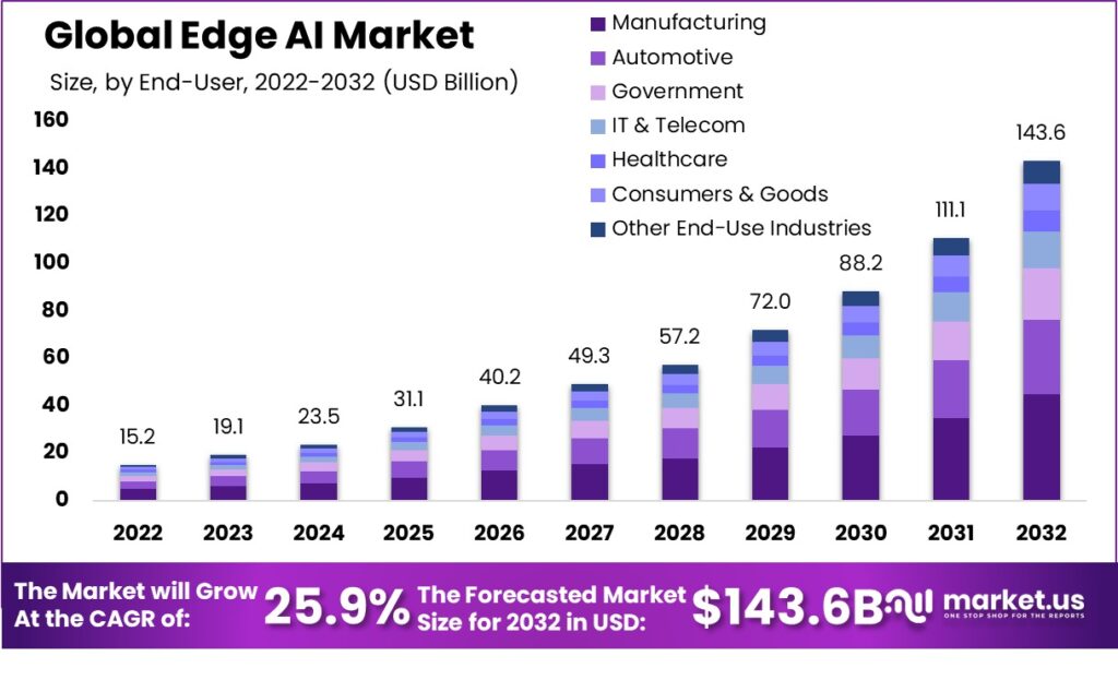 據行業(yè)調研機構數據,邊緣人工智能市場從2023年的191億美元起,將以25.9%的年復合增長率迅速擴展至2032年,達到1436億美元市場規(guī)模。不同于大火的ChatGPT,邊緣AI是將人工智能算法部署在接近數據源的邊緣設備上,如物聯網設備、智能手機及嵌入式系統等。與依賴云計算的人工智能相比,邊緣AI通過在本地處理數據,減少了向中央服務器頻繁傳輸數據的需求。這種方式帶來了包括更低的延遲、降低的帶寬消耗、提升的隱私保護以及更高的操作效率等多方面優(yōu)勢。