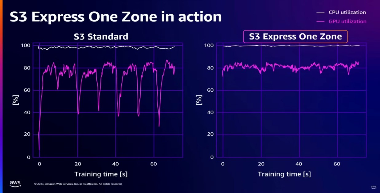對(duì)于計(jì)算密集型負(fù)載,Amazon S3 Express One Zone延遲的降低對(duì)用戶有顯而易見的價(jià)值。用ImageNet數(shù)據(jù)集進(jìn)行為期15天訓(xùn)練時(shí),GPU經(jīng)常需要等候標(biāo)準(zhǔn)版Amazon S3加載數(shù)據(jù),而在換成S3 Express One Zone之后,GPU利用率持續(xù)穩(wěn)定在高水平,最終提早完成任務(wù),釋放了GPU資源并節(jié)省成本。