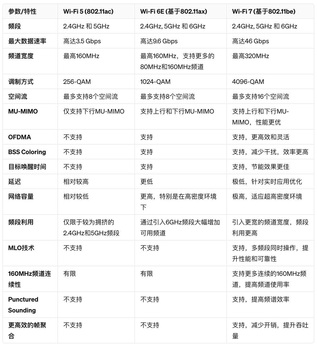 讓我們來(lái)細(xì)數(shù)都有哪些特性更新:首先是Wi-Fi 7支持最高320 MHz的頻寬,相比Wi-Fi 6的最高160 MHz頻寬,這提升了數(shù)據(jù)傳輸?shù)乃俾?;第二是較于Wi-Fi 6的1024-QAM,Wi-Fi 7支持更高階的4096-QAM調(diào)制技術(shù),這進(jìn)一步提升了數(shù)據(jù)傳輸?shù)男?;第三是Wi-Fi 7引入了MLO技術(shù),允許設(shè)備同時(shí)在多個(gè)頻率帶上操作(如2.4 GHz、5 GHz、6 GHz),這樣可以提高網(wǎng)絡(luò)的可靠性和吞吐量;第四是Wi-Fi 7對(duì)正交頻分多址(OFDMA)技術(shù)進(jìn)行了改進(jìn),提高了尤其是在高密度環(huán)境中的頻譜使用效率;第五是Wi-Fi 7通過(guò)優(yōu)化調(diào)度算法和引入新的傳輸機(jī)制,顯著減少了網(wǎng)絡(luò)延遲,為實(shí)時(shí)應(yīng)用提供更好的支持;第六是采用了Preamble puncturing技術(shù),允許Wi-Fi 7設(shè)備在存在干擾的情況下,更靈活地使用可用的頻譜資源,從而提高頻譜的利用率;第八是引入了更先進(jìn)的干擾管理和避免技術(shù),減少了不同網(wǎng)絡(luò)之間的干擾,提升了網(wǎng)絡(luò)的整體性能。