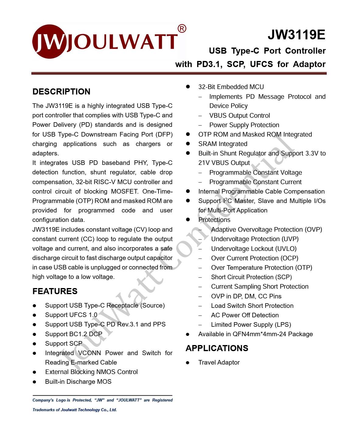 JW3119E是一款高集成度的USB Type-C端口控制器,符合USB Type-C規(guī)范、Battery Charging Spec. V1.2協(xié)議、滿足UFCS協(xié)議電氣特性及時序、物理層、協(xié)議層、應(yīng)用層、功率規(guī)則等協(xié)議要求,和PD 3.1標(biāo)準(zhǔn),專為USB Type-C下行端口(DFP)充電應(yīng)用而設(shè)計。