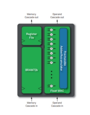 圖中文字說明:Register File - 寄存器文件,F(xiàn)racturable Adder/Accumulator - 可拆分的加法器/累加器,F(xiàn)loat MAC - 浮點(diǎn)乘累加單元(MAC),Memory Cascade in - 存儲(chǔ)器級(jí)聯(lián),Operand Cascade in - 操作數(shù)級(jí)聯(lián)。