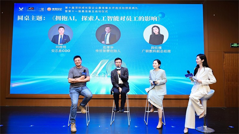 安芯易運營總裁劉維明先生受邀出席了本次頒獎典禮并上臺接受獎項。在活動的圓桌論壇部分,劉維明先生與傳世智慧創(chuàng)始人及總裁范厚華先生和廣聯(lián)數(shù)科副總經(jīng)理段紋瑾女士圍繞“擁抱AI:探究人工智能如何影響員工”的議題展開了精彩的交流和討論。