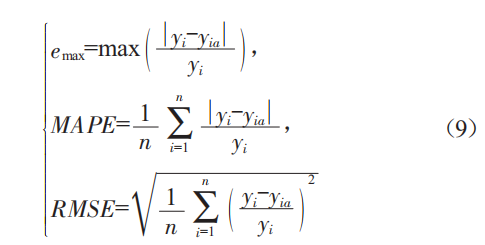 采用emax、MAPE以及RMSE來表征各預測模型預測結果的準確程度,其具體計算公式為: