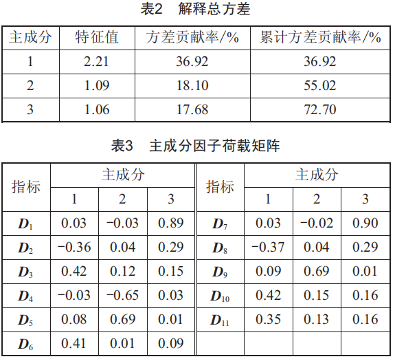 通過PCA方法可知,KMO和Bartlett檢驗值分別為0.65和0.00,各因素之間具有相關性。具體分析結果如下:解釋總方差如表2所示,主成分因子荷載矩陣如表3所示。
