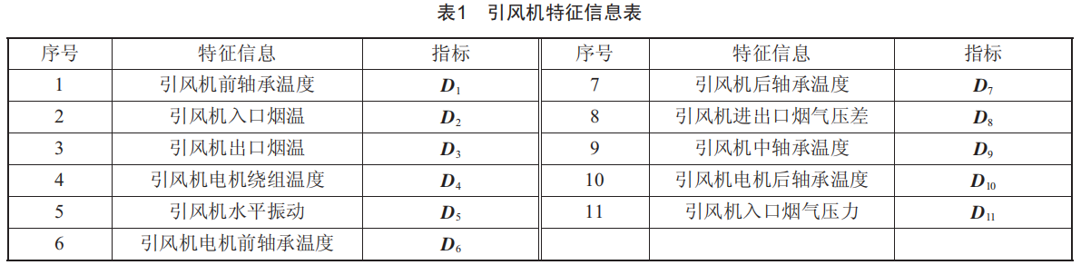 本文以西北地區(qū)某發(fā)電機組中引風機為研究對象,數(shù)據(jù)采集時間為2023年1月10日__12日,每隔1min采集一次。引風機狀態(tài)的好壞并非是由單個變量所決定的,其主要受到各個部位的溫度、壓差等影響,通過實時在線監(jiān)控系統(tǒng)獲取到表1所示參數(shù)值作為輸入、輸出向量,其中,D1~D10為輸入向量,D11為輸出向量。