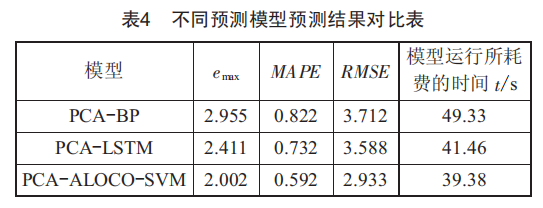 2)通過將PCA引入ALOCO—SVM、LSTM和BP預測模型中得知,本研究構建的PCA—ALOCO—SVM模型的預測結果與試驗數(shù)據(jù)基本一致。與其他兩個預測模型相比,PCA—ALOCO—SVM模型的平均絕對誤差和均方根誤差等評估指標都小于其他模型,這驗證了本研究構建的組合模型具有較高的擬合度和預測性能,可以滿足實際火電廠生產(chǎn)活動的需求。