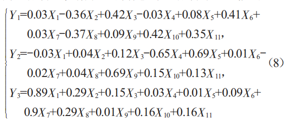 當主成分特征值大于1時,提取數(shù)目為3,其累計方差百分比即貢獻率大于70%,可將該成分提出作為主成分。依據(jù)表3可構建3個主成分表達式如下: