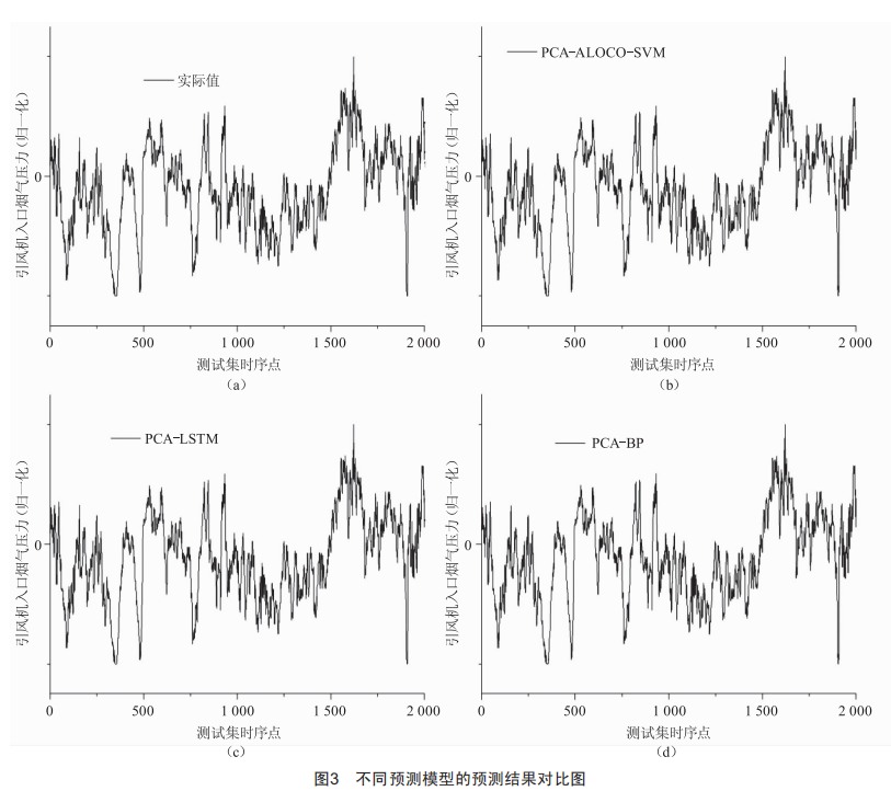 1)本文基于火電機組實時監(jiān)測系統(tǒng)所采集的數(shù)據(jù),利用鄰近均值法、小波降噪和歸一化處理對所采集的數(shù)據(jù)進行預處理,保證了數(shù)據(jù)的完整性與可靠性。采用PCA對影響引風機入口煙氣壓力值的11個因素進行降維處理,提取出3個主成分,減少了預測輸入集的維度,提高了ALOCO—SVM模型預測精度。