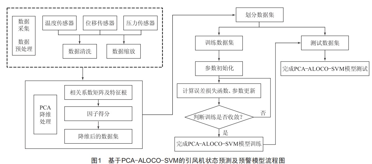 本文提出的基于PCA-ALOCO-SVM的引風機狀態(tài)預測及預警模型建立流程如圖1所示。