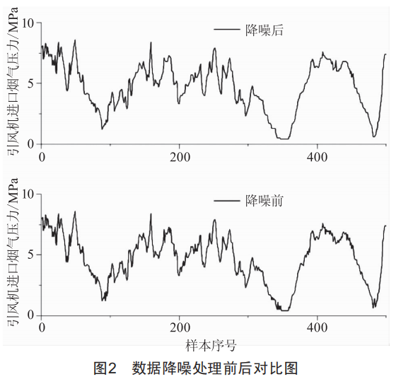 對引風機運行狀態(tài)樣本數(shù)據(jù)進行降噪處理,其中引風機進口煙氣壓力降噪前后對比如圖2所示。