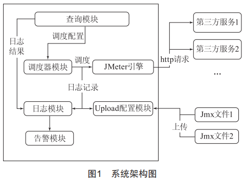 自研撥測系統(tǒng)采用程序加JMeter腳本方式設計實現(xiàn)。圖1展示了整個系統(tǒng)的設計圖,整個系統(tǒng)分為三個部分: