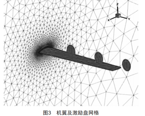 在CFD計(jì)算中,暫不考慮螺旋槳槳轂。首先采用pointwise生成粗、中、細(xì)三套非結(jié)構(gòu)網(wǎng)格進(jìn)行網(wǎng)格無關(guān)性驗(yàn)證。其中,中等網(wǎng)格點(diǎn)數(shù)為194萬,激勵盤網(wǎng)格數(shù)設(shè)置為徑向15個點(diǎn)、周向75個點(diǎn),網(wǎng)格示意圖如圖3所示。計(jì)算馬赫數(shù)0.233,采用定升力0.55計(jì)算,可以得到,網(wǎng)格點(diǎn)數(shù)由91萬增加到194萬時,阻力變化量較大,將網(wǎng)格點(diǎn)數(shù)增加到292萬,得到的阻力變化量較小,基本達(dá)到計(jì)算精度要求。因此,選用網(wǎng)格點(diǎn)數(shù)為292萬的網(wǎng)格進(jìn)行后續(xù)靜氣彈計(jì)算。