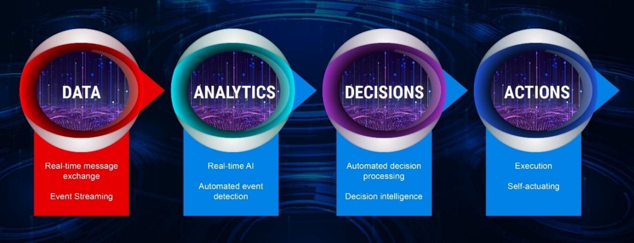 消息總線必須支持實(shí)時(shí)智能化(管理實(shí)時(shí)決策和實(shí)時(shí)數(shù)據(jù)傳輸)來支持所有的自動(dòng)化等級(jí)。結(jié)合實(shí)時(shí)數(shù)據(jù)傳輸與流事件(如來自設(shè)備或傳感器的數(shù)據(jù)),AI(人工智能)可以分析數(shù)據(jù)、做出決策并采取行動(dòng)(如下圖所示)。過慢的消息總線傳輸速度會(huì)導(dǎo)致數(shù)據(jù)延遲,無法獲取實(shí)時(shí)視圖。