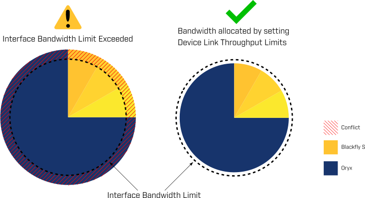 Oryx 可與其他 Oryx 10GigE 相機(jī)或 GigE 相機(jī)(如 FLIR Blackfly S)一起用于多相機(jī)系統(tǒng)。為確保性能可靠,必須在相機(jī)之間共享可用的接口帶寬。 超過交換機(jī)與主機(jī)之間的接口帶寬將導(dǎo)致丟包和丟幀。