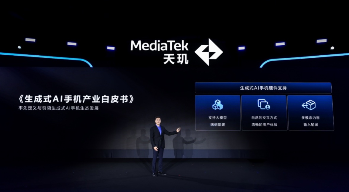在天璣開發(fā)者大會(huì)上,聯(lián)發(fā)科聯(lián)合Counterpoint并攜手阿里云通義千問、百川大模型、虎牙、酷狗音樂、零一萬物、OPPO、Soul、騰訊AI Lab、騰訊混元、vivo行業(yè)頭部伙伴聯(lián)合發(fā)布《生成式AI手機(jī)產(chǎn)業(yè)白皮書》,共同定義了“生成式AI手機(jī)”的概念和典型特征?!栋灼诽岬剑荷墒紸I手機(jī)是利用大規(guī)模、預(yù)訓(xùn)練的生成式AI模型,實(shí)現(xiàn)多模態(tài)內(nèi)容生成、情境感知,并具備不斷增強(qiáng)的類人能力。生成式AI手機(jī)開啟了智能手機(jī)發(fā)展的新周期,長(zhǎng)遠(yuǎn)看,智能手機(jī)將會(huì)發(fā)展為移動(dòng)智能體。