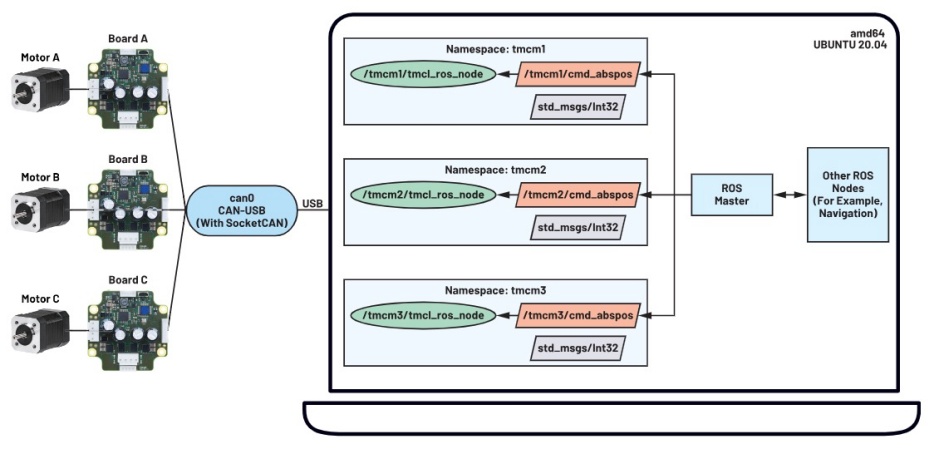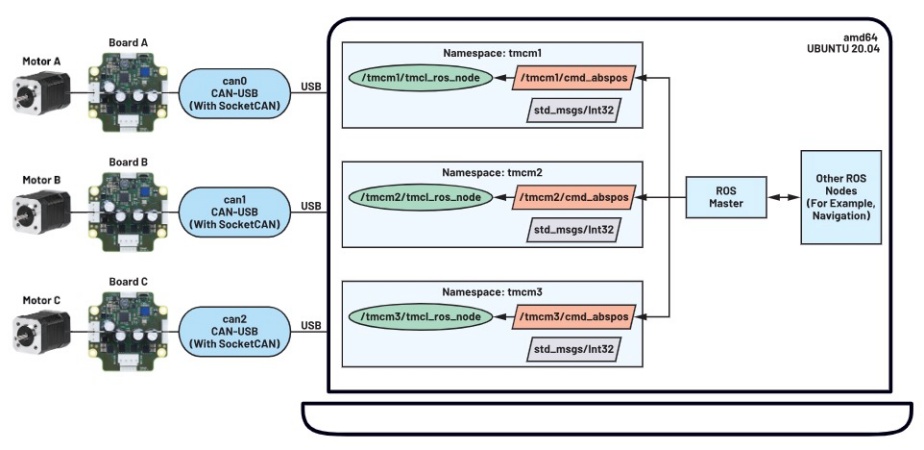 用戶可以連接ROS系統(tǒng)來發(fā)送至這些特定指令,從而控制電機的運動。指令的選擇取決于具體應(yīng)用、TMC設(shè)置以及所用電機的類型。例如,對于輪式機器人,用戶可以選擇設(shè)置速度;而對于夾具,設(shè)置位置會更合適。