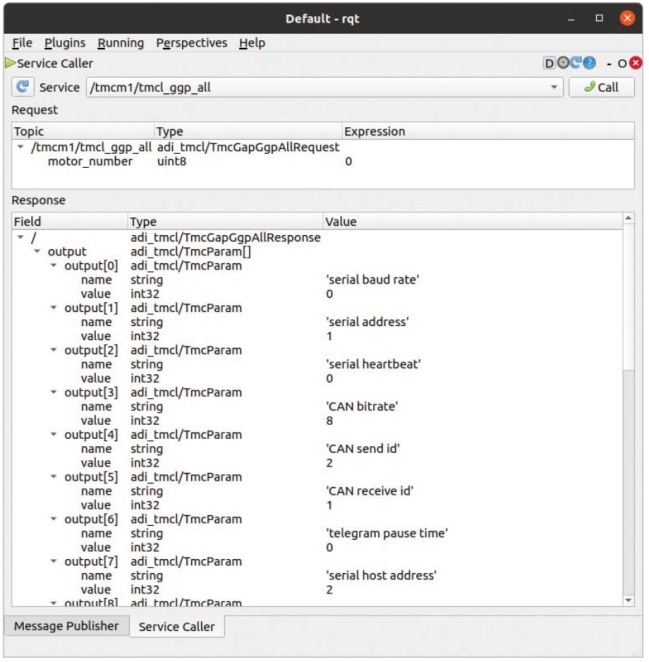 用戶可以將ROS系統(tǒng)與此功能集成,以滿足特定應(yīng)用的需求。例如,此服務(wù)可以捕獲TMC板的當(dāng)前設(shè)置和狀態(tài),包括AP(例如編碼器步長、PI調(diào)諧、換向模式等)。