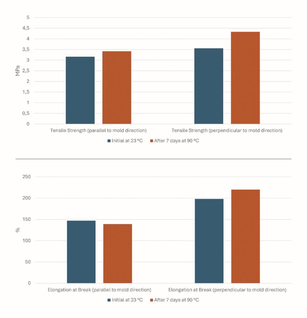 表格:TC7RQP-BLCK(67 邵氏 A 硬度)與根據(jù)WDK指南2701“EPDM-TPE混合組件”的EPDM的包膠性(© 凱柏膠寶®版權(quán)所有)