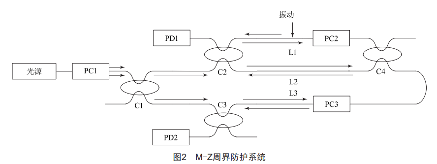 M—Z周界防護(hù)系統(tǒng)如圖2所示,該系統(tǒng)包括1個(gè)光源,3個(gè)偏振控制器PC1、PC2、PC3,4個(gè)2×2耦合器C1、C2、C3、C4,以及3根單模光纖L1、L2、L3。